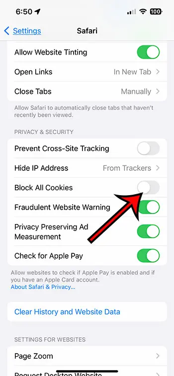 設備上的 Safari 菜單中有一個開關,可讓您控制是否阻止或允許這些 cookie。