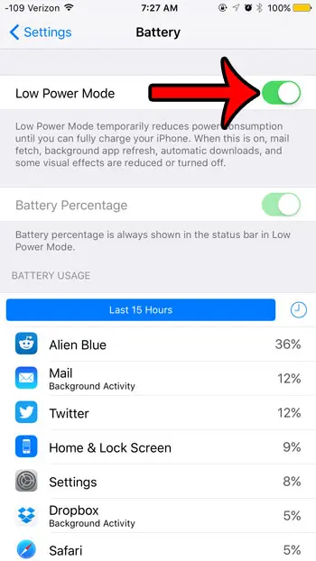 現在您已經了解瞭如何在 iPhone 6 上啟用低電量電池模式,您可以根據您認為在為設備充電之前是否還有足夠的電池壽命,使用以下步驟來打開或關閉該設置。