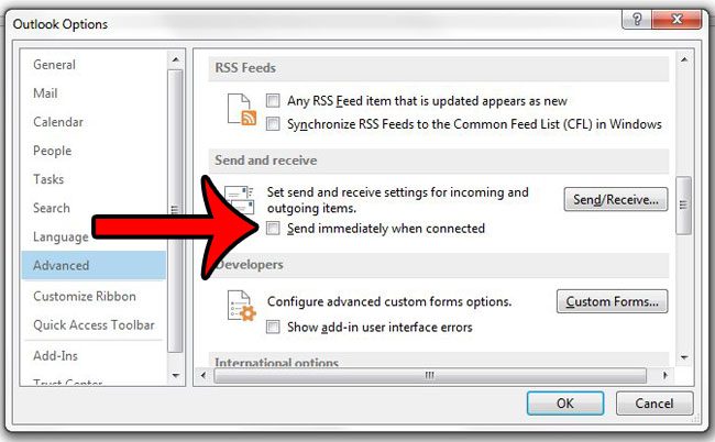 第 5 步:向下滾動到發送和接收菜單部分,然後單擊左側的框連接後立即發送刪除複選標記。如果您還想關閉自動發送和接收選項,請繼續執行以下步驟。