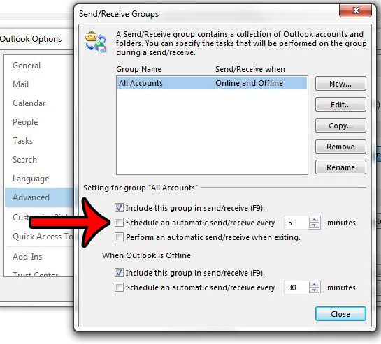 第7步:點擊左側的方框安排自動發送/接收刪除複選標記。然後您可以單擊關閉按鈕位於窗口底部,然後單擊好的按鈕位於底部展望選項窗戶。