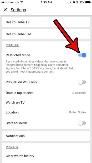 我們的文章繼續在下面提供有關在 iPhone 上啟用或禁用 YouTube 受限模式的更多信息,包括這些步驟的圖片。