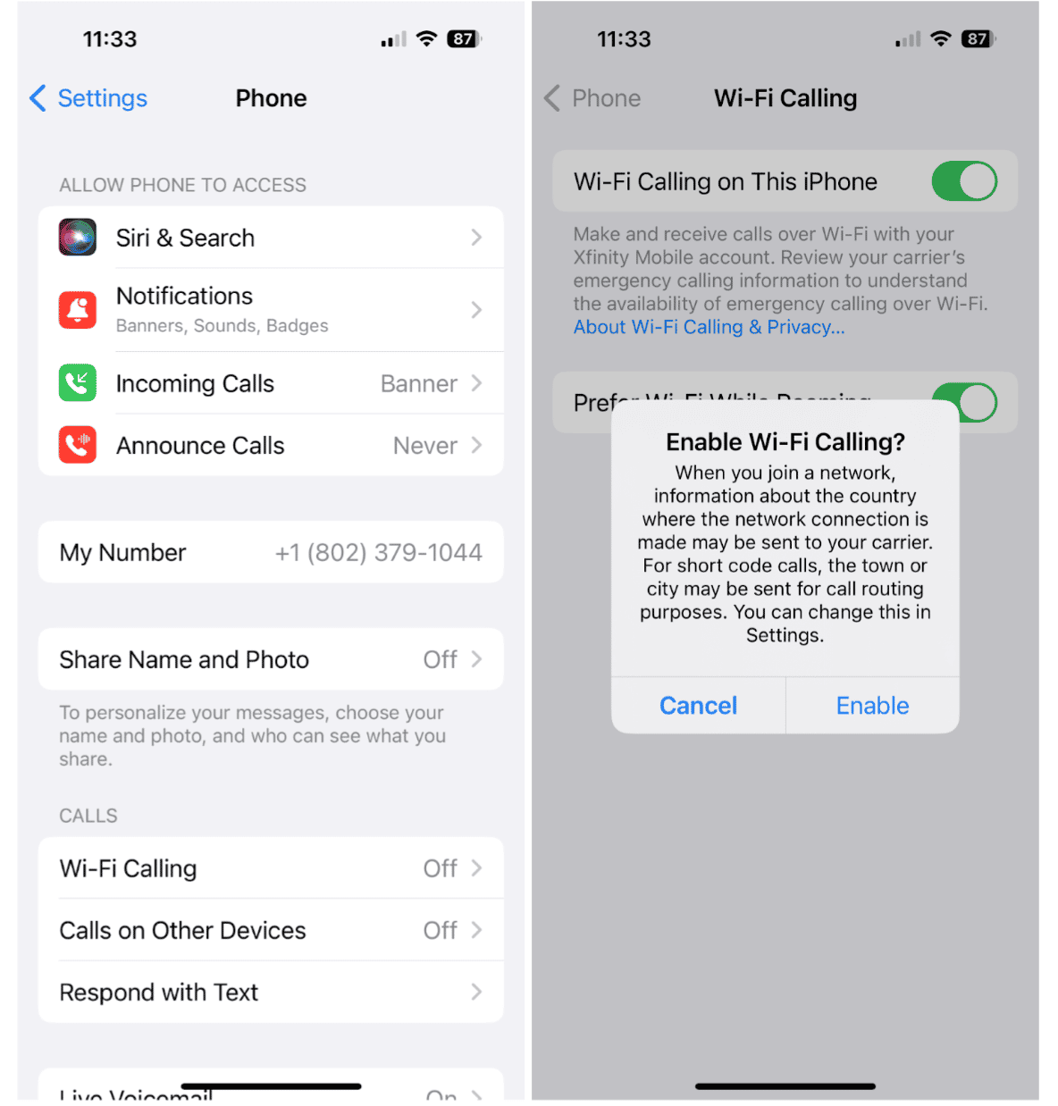 - 打開“此 iPhone 上的 Wi-Fi 通話”並點擊“啟用”。