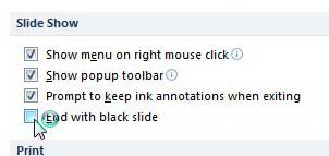 要解決此問題,您可以轉到“文件”>“選項”>“高級”>,然後取消選中“以黑色幻燈片結束”旁邊的複選框。