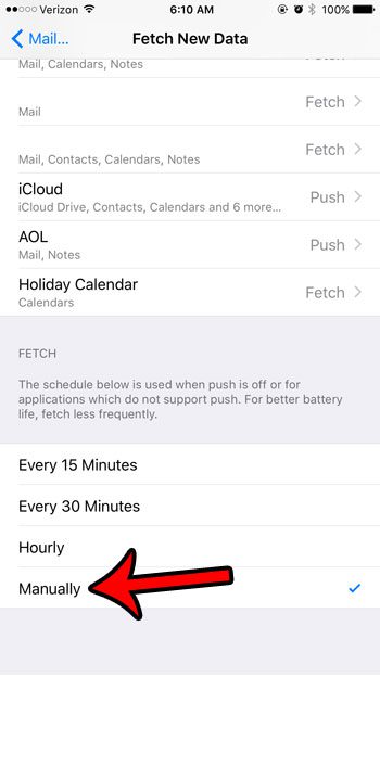 請注意,如果您的 iPhone 上有多個電子郵件帳戶並且想要手動獲取所有電子郵件帳戶,則您需要為每個帳戶更改此設置。啟用手動獲取後,您的 iPhone 將不會檢查或下載新電子郵件,直到您打開“郵件”應用程序。
