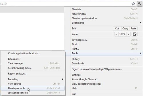 然後,您可以通過單擊自定義和控制 Google Chrome按鈕位於窗口右上角,單擊工具選項,然後單擊開發者工具。