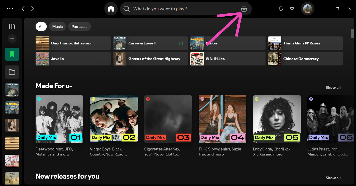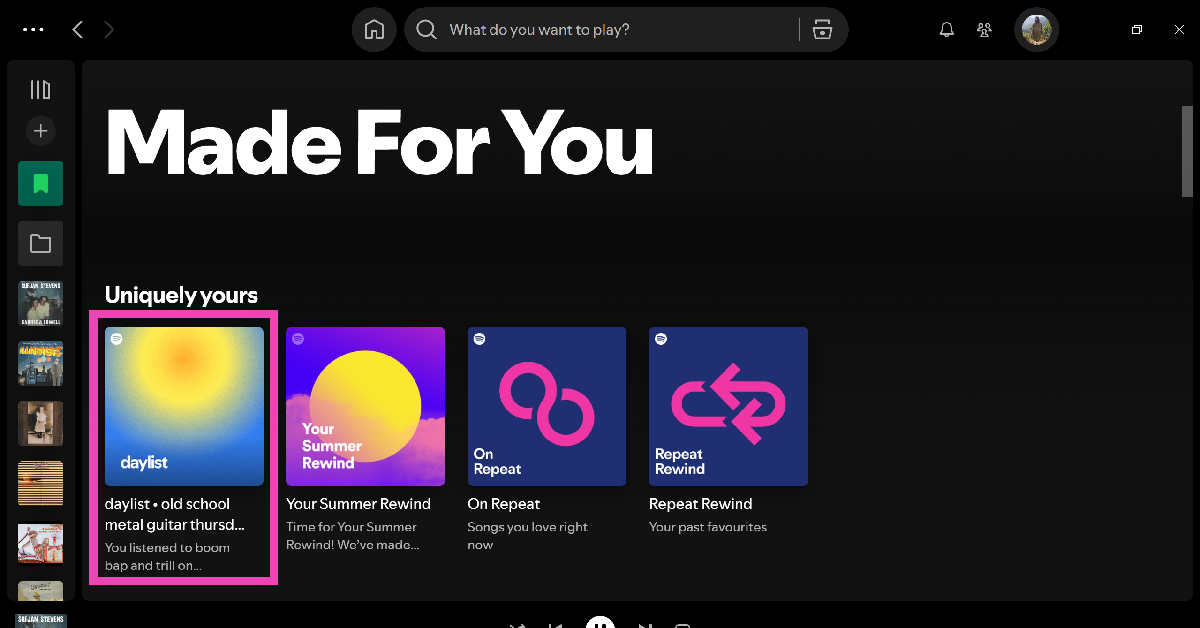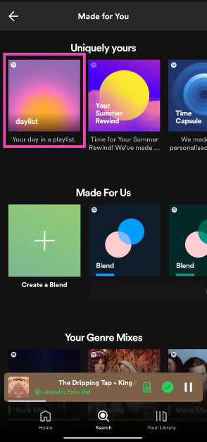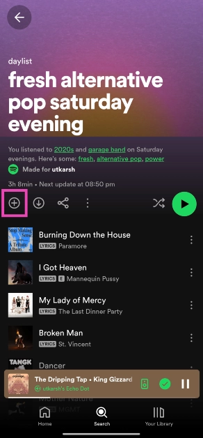 您可以在 Spotify 的“為您打造”部分找到您的日列表。點擊加號圖標將其添加到您的庫中。