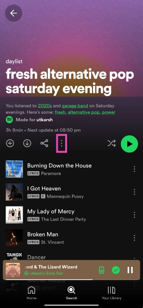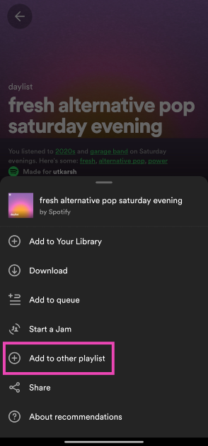 Spotify 不允許您保存每日列表。但是,您可以通過點擊省略號並選擇將其轉移到播放列表添加到其他播放列表>新播放列表。