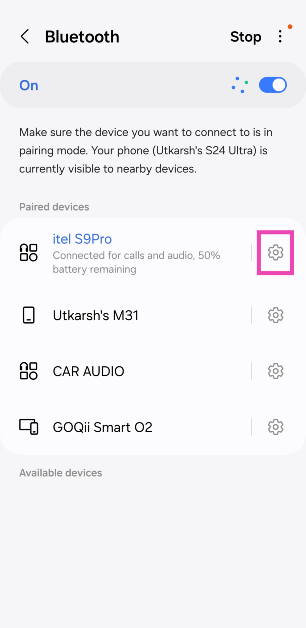 步驟2:擊中齒輪圖標位於已連接的 TWS 旁邊。