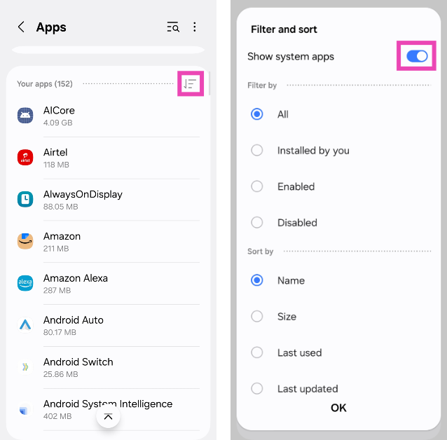 步驟2:擊中過濾器圖標然後打開旁邊的切換開關顯示系統應用程序。