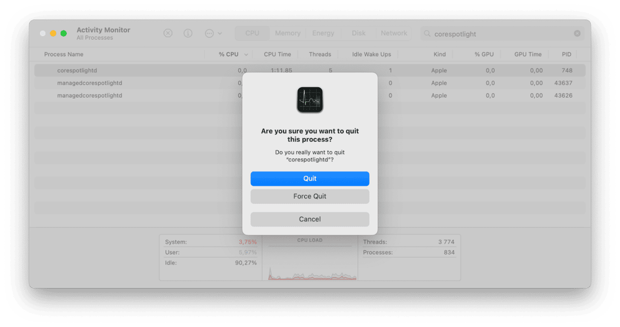 第一步是檢查 Spotlight 高 CPU 使用率是否是一次性的並退出該進程。無需擔心;該過程將自動重新啟動。
