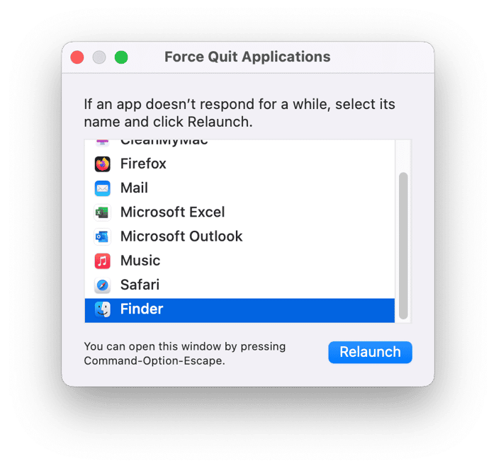 一如既往,從最簡單的修復開始是有意義的。嘗試強制退出 Finder,方法是單擊 Apple 菜單,選擇“強制退出”,選擇 Finder,然後單擊“重新啟動”。