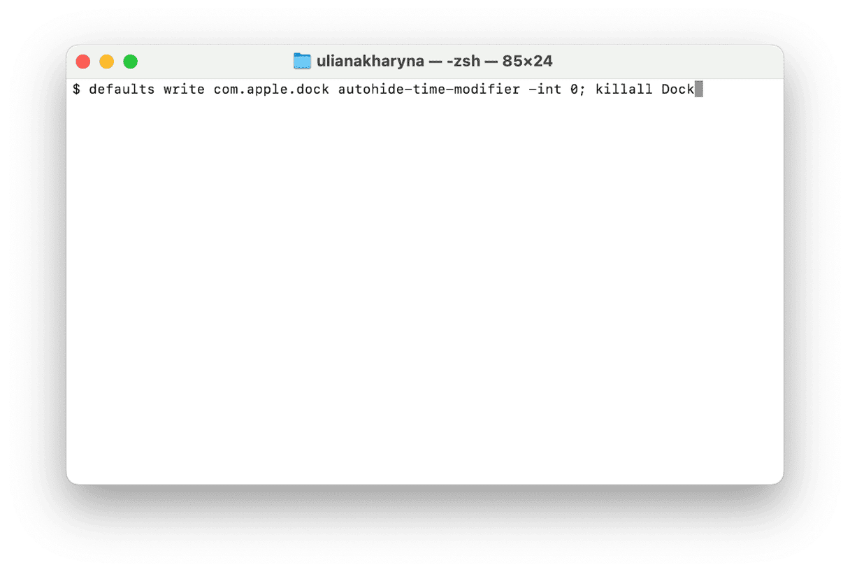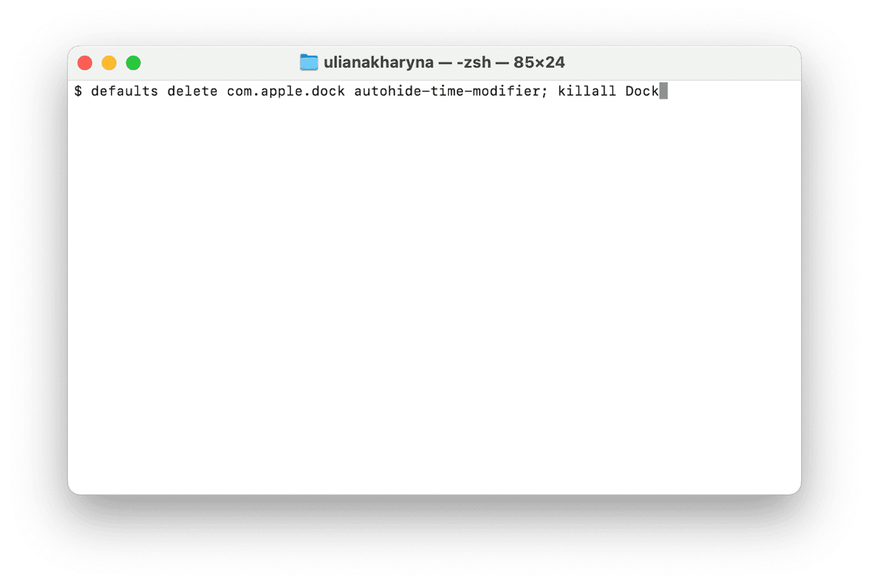 defaults delete com.apple.dock autohide-time-modifier; killall Dock - 按回車鍵。