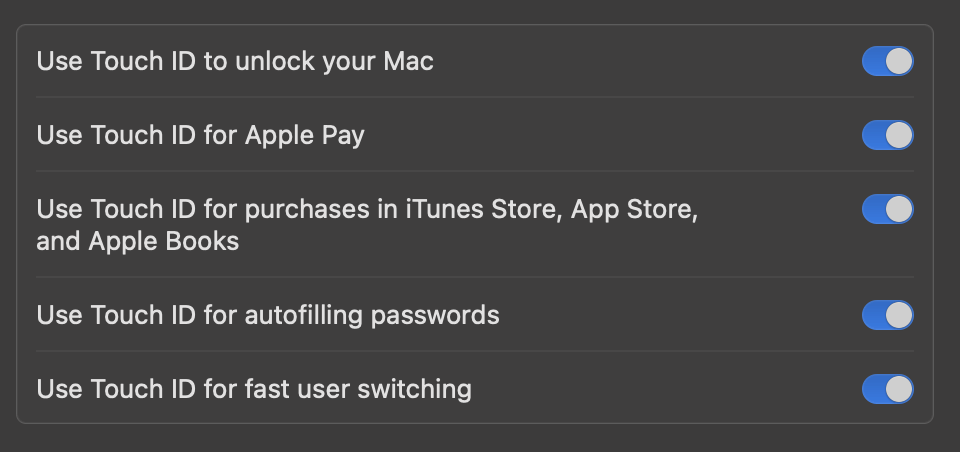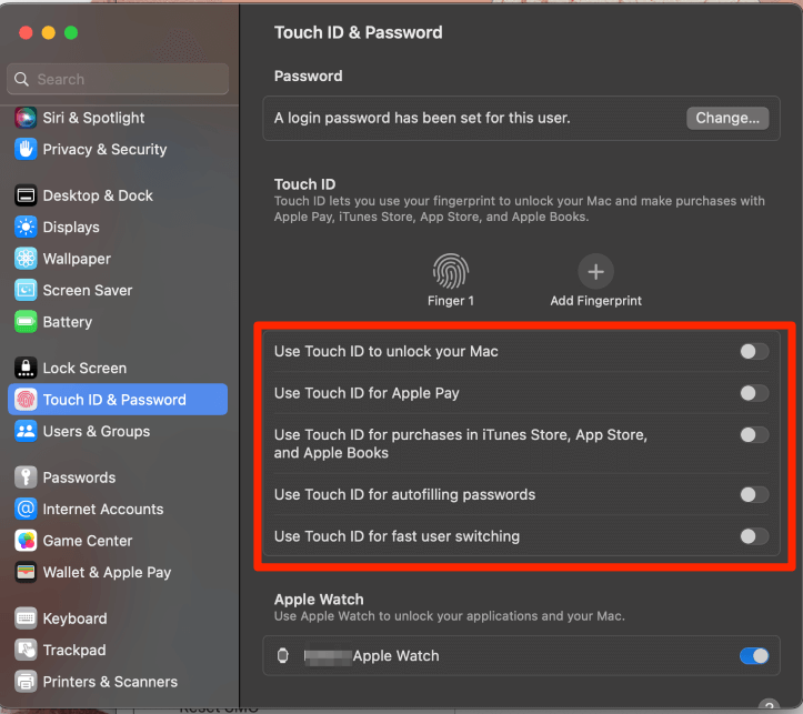嘗試讓 TouchID 重新工作的另一個方法是關閉所有 Touch ID 選項,重新啟動 Mac,然後再次打開它們。