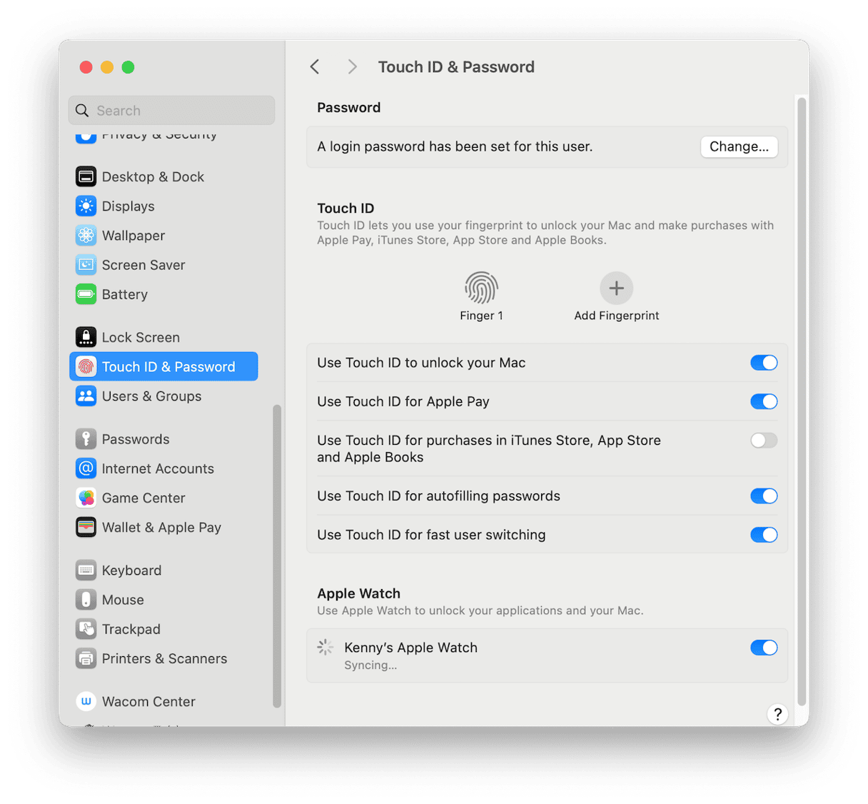 - 檢查您的 Mac 是否已設置為允許 Apple Watch 解鎖。打開系統設置並單擊 Touch ID 和密碼。 Apple Watch 下方的開關應設置為打開。