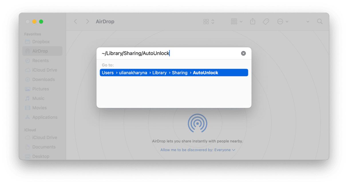 ~/Library/Sharing/AutoUnlock並按回車鍵。在該文件夾中,將這些文件拖到廢紙簍:ltk.plist、pairing-records.plist