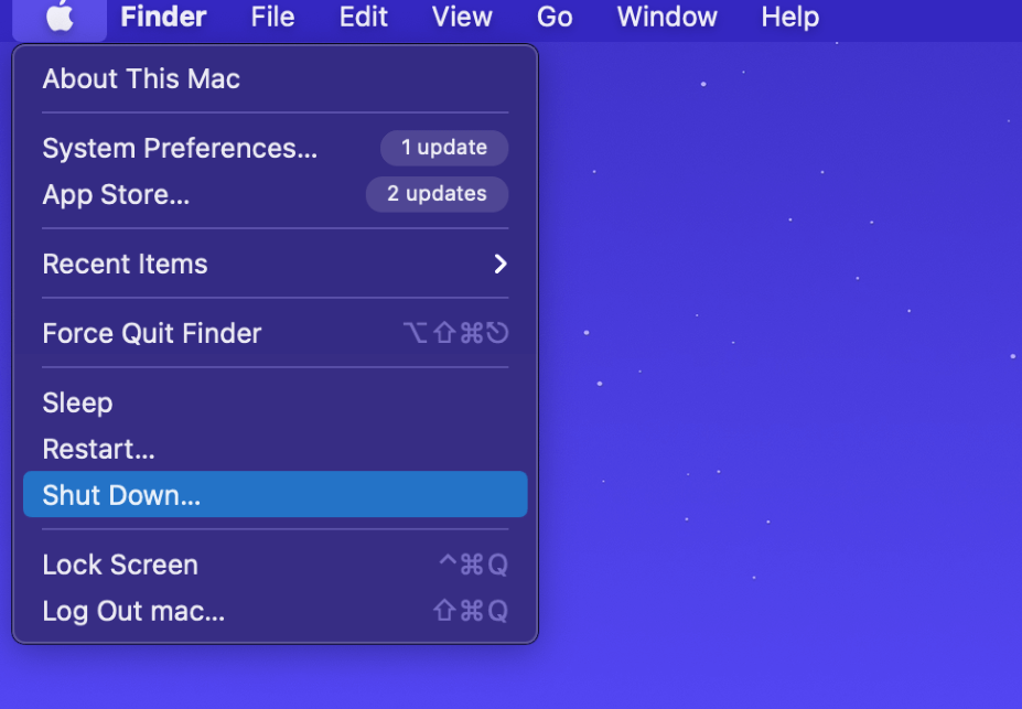 通常最簡單的修復方法之一是重新啟動你的MacBook。有時我們經常會忘記一些顯而易見的事情,但重新啟動計算機可以清除任何小軟件錯誤。通過選擇完全關閉計算機關閉 向下從蘋果 圖示在左上角。
