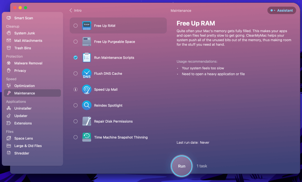 安裝 CleanMyMac X 後,選擇維護從左側邊欄選項。確保跑步 維護 腳本已選中並單擊跑步。從那裡開始,一切都將由應用程序處理。