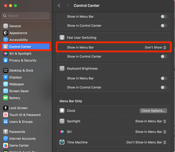 這使您可以在 Mac 的用戶之間快速切換(顧名思義)。通過關閉此功能,它可能會導致您的菜單欄重新出現並重新開始工作。