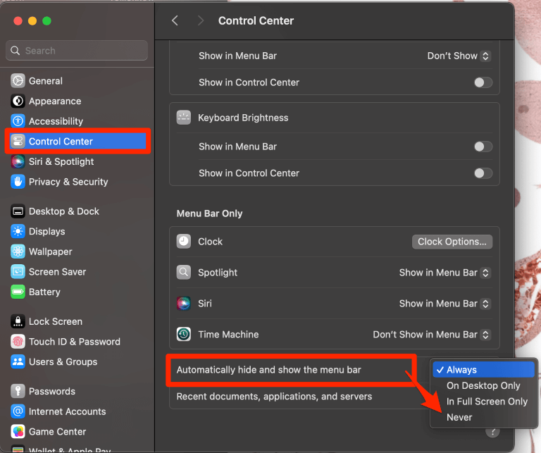在左邊,選擇控制中心。在右側,一直滾動到底部。如果您希望菜單欄始終顯示,請選擇絕不在下拉菜單中自動隱藏和顯示菜單欄。