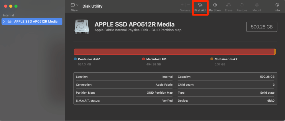 選擇您的 Apple SSD,然後選擇頂部的急救。按照屏幕上的提示進行操作。