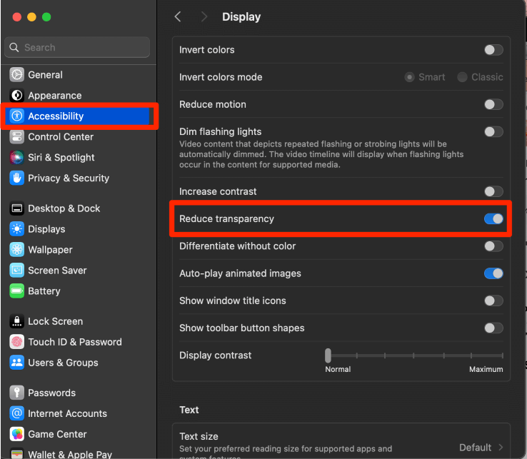 通過選擇降低透明度,菜單欄在顯示屏上根本不會“透視”,從而更容易看到。這將使顏色顯得更暗。