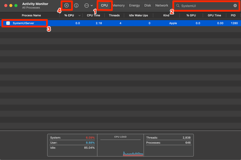 選擇屏幕頂部的 CPU,然後搜索 SystemUIServer。找到它後,選擇它並單擊 X 退出它。服務器將自動重新啟動。