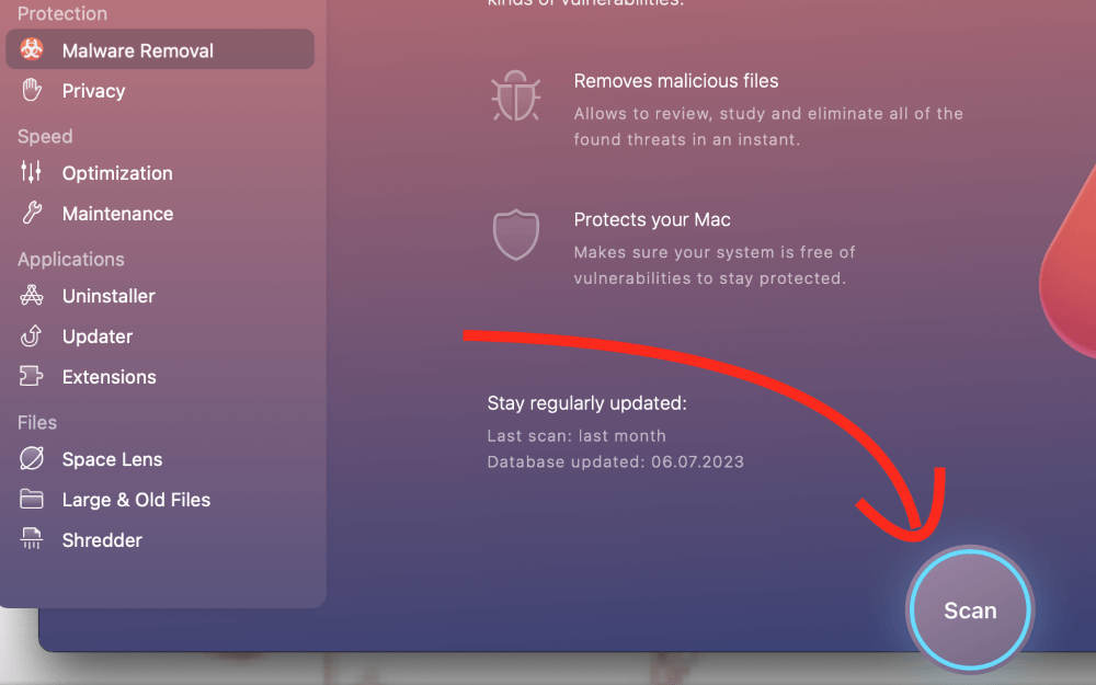 下載並安裝該應用程序後,啟動它並從左側菜單中選擇惡意軟件刪除。打掃描,CleanMyMac 將處理剩下的事情。
