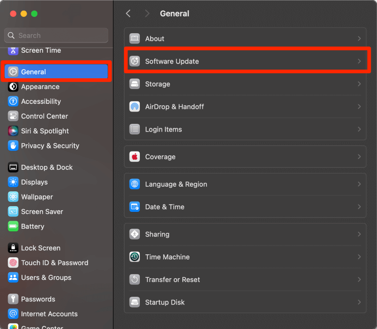 再次在系統設置,這一次,前往一般的在左側。選擇軟件更新在右側。