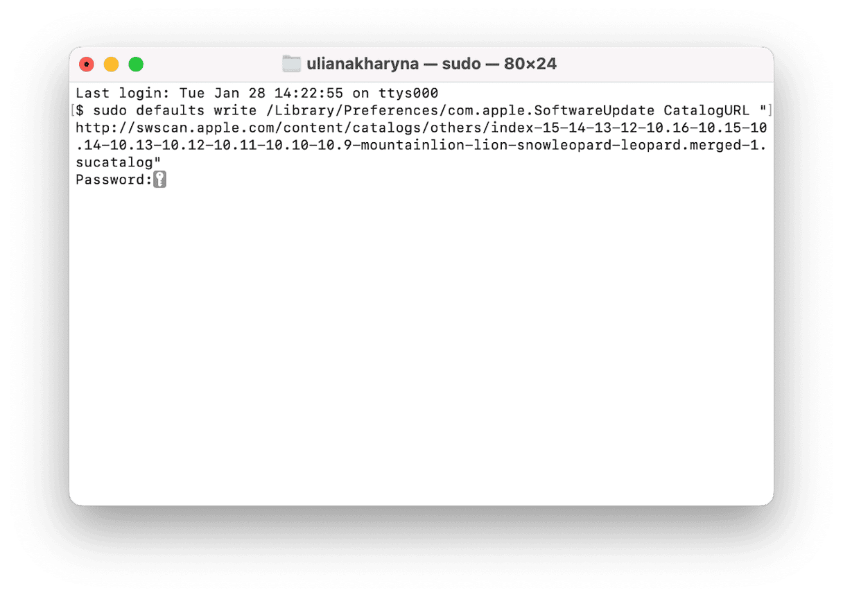 - 鍵入或粘貼以下命令: sudo defaults write /Library/Preferences/com.apple.SoftwareUpdate CatalogURL “https://swscan.apple.com/content/catalogs/others/index-15-14-13-12-10.16-10.15-10.14-10.13-10.12-10.11-10.10-10.9-mountainlion-lion-snowleopard-leopard.merged-1.sucatalog”
