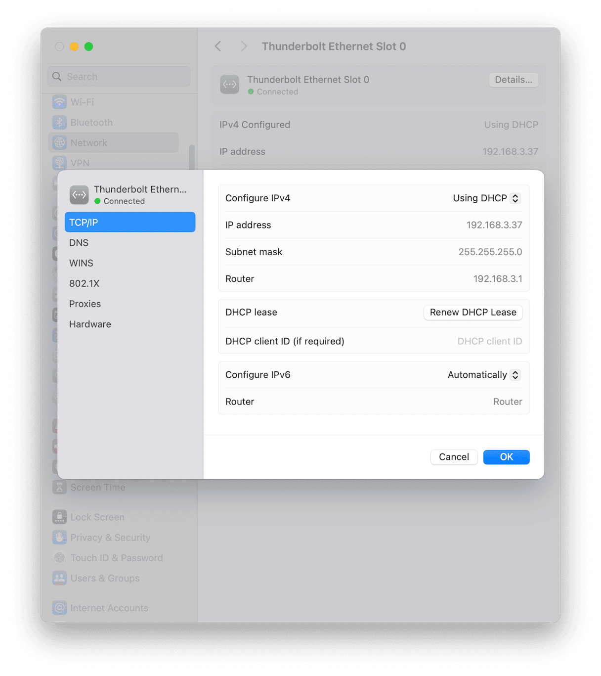 - 選擇 TCP/IP 並單擊續訂 DHCP 租約。