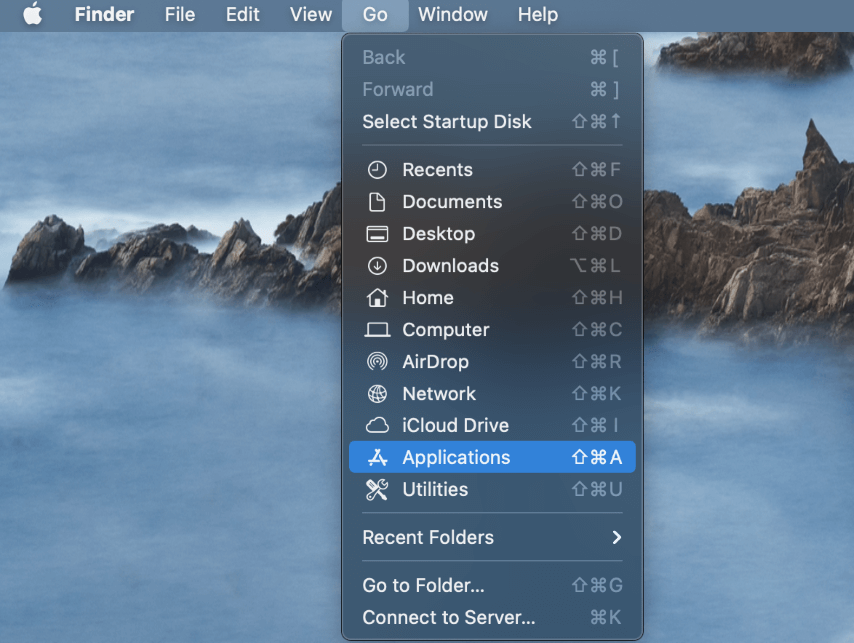 首先,打開您的應用 文件夾並找到蒸汽。您可以通過單擊找到應用程序文件夾去頂部菜單欄中的下拉菜單。