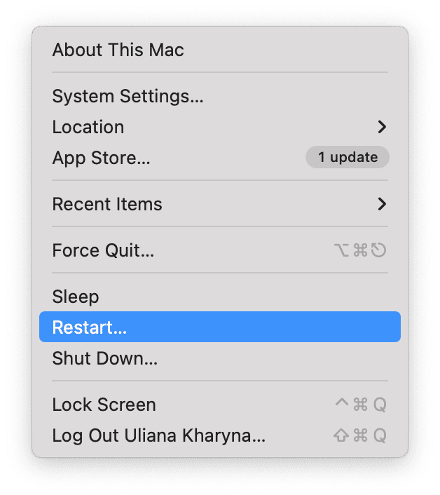 如果再次發生這種情況,請重新啟動 Mac。在採用 Apple 芯片的 Mac 上,重新啟動會重置系統管理控制器和 NVRAM,並修復啟動磁盤的問題。因此,請轉到 Apple 主菜單並選擇“重新啟動”。