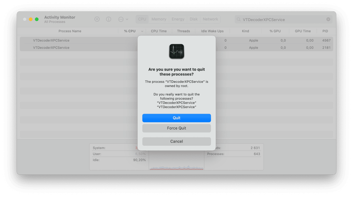 一旦確定 VTDecoderXPCService 是問題所在,您可以在活動監視器中選擇它,然後單擊工具欄中的“x”將其退出。然後,退出活動監視器。
