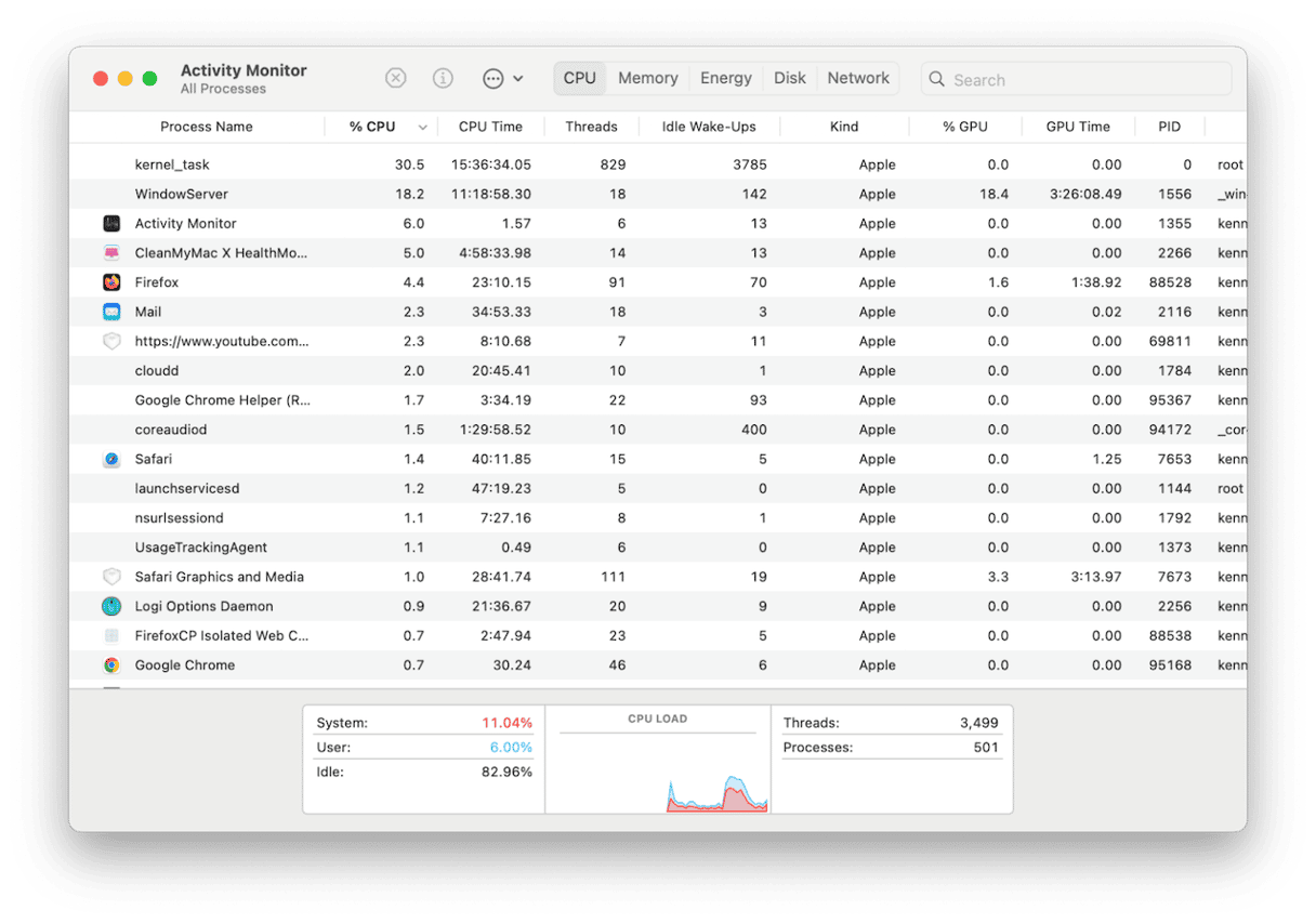 - 您將看到按其使用的 CPU 週期順序列出的進程。通常,該列表從最高消耗者開始,列頂部 CPU 旁邊的箭頭指向下方。如果情況並非如此,請單擊列標題以在頂部查看最高的消費者。