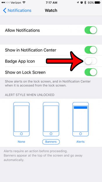 第四步:點擊右側的按鈕徽章應用程序圖標將其關閉。當按鈕位於左側位置時,數字就會消失,並且周圍沒有綠色陰影。我已經關閉了下圖中的手錶徽章應用程序圖標。