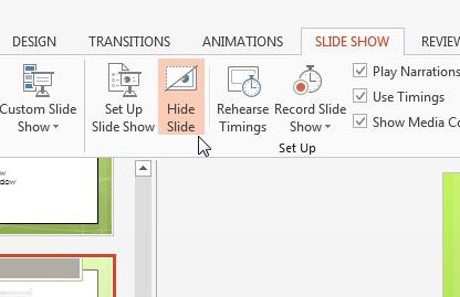 您還可以通過單擊隱藏幻燈片幻燈片放映窗口頂部的選項卡,然後單擊隱藏幻燈片按鈕在設定導航功能區的部分。