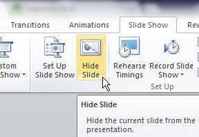 單擊隱藏幻燈片按鈕在設定絲帶部分。您還可以通過右鍵單擊幻燈片,然後選擇快捷菜單底部的“隱藏幻燈片”選項來隱藏幻燈片。