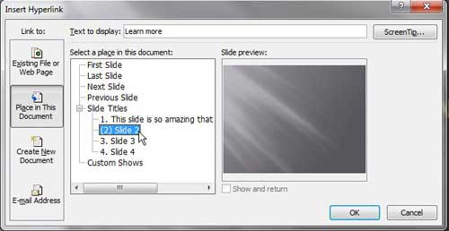 既然幻燈片已隱藏,您可能應該為自己提供一種在需要時調用它的方法。您可以通過選擇要放置指向您幻燈片的鏈接的幻燈片來完成此操作。