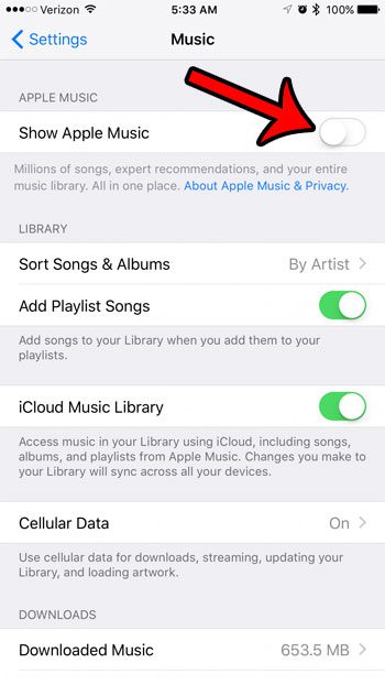 第三步:點擊右側的按鈕顯示蘋果音樂將其關閉。當按鈕周圍沒有綠色陰影且按鈕位於左側位置時,該設置關閉。下圖中它被禁用。