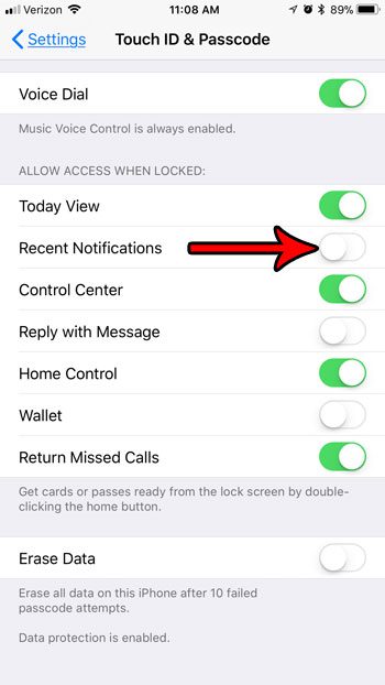 第 4 步:向下滾動到鎖定時允許訪問菜單的一部分,然後點擊右側的按鈕最近的通知將其關閉。下圖中我的 iPhone 配置為不在鎖定屏幕上顯示最近的通知。
