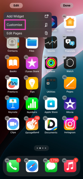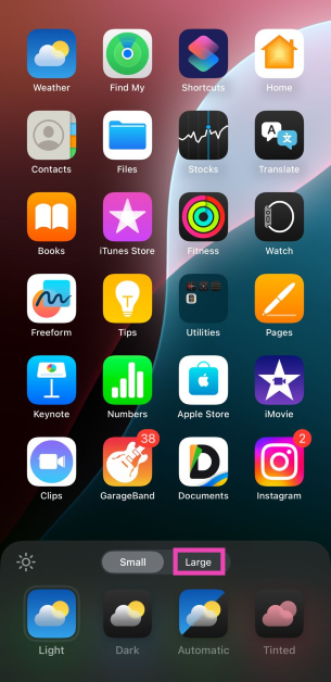 如果增加圖標大小,iOS 18 會隱藏主屏幕上的應用程序名稱。長按主屏幕上的任何空白處,點擊“編輯”,然後點擊“大”以隱藏應用程序名稱。