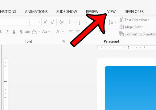 以下步驟將隱藏 Powerpoint 2013 中可見的任何標尺。如果您稍後決定再次使用標尺,只需按照這些步驟操作並選中我們稍後將取消選中的複選框即可。
