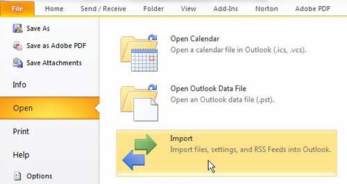 通過啟動 Outlook 2010 開始將 CSV 聯繫人導入 Outlook。單擊橙色文件Outlook 程序窗口左上角的選項卡,然後單擊打開窗口左側的選項。