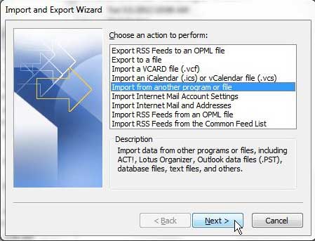 接下來要做的就是單擊進口按鈕位於窗口中央,這將打開一個新的導入和導出嚮導Outlook 中的窗口。單擊從另一個程序或文件導入選項,然後單擊下一個按鈕位於窗口底部。