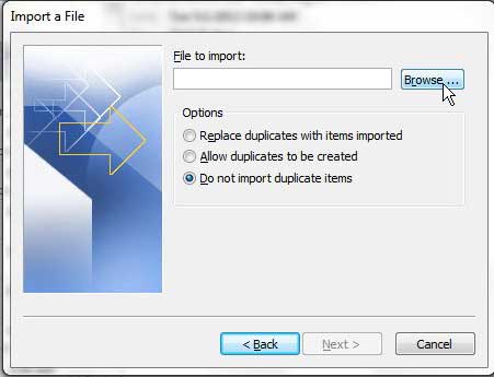 單擊瀏覽窗口頂部的 按鈕,然後找到要導入 Outlook 2010 的 CSV Excel 列表。選擇要用於處理 Outlook 可能遇到的任何重複聯繫人文件的選項,然後單擊下一個按鈕。