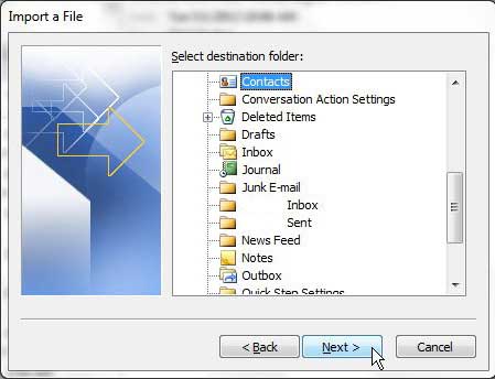 單擊聯繫方式下的選項選擇目標文件夾選項,然後單擊下一個再次按鈕。