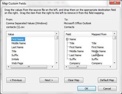 該屏幕如下圖所示。窗口左側的列表示您嘗試導入的 Excel 列表中定義的字段,窗口右側的列中的字段是 Outlook 中的聯繫人字段。