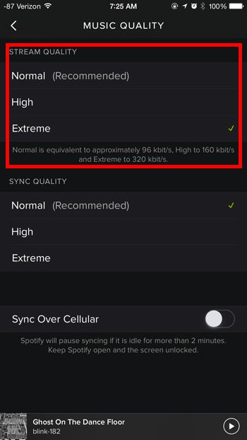 iPhone Spotify 應用程序提供了一個設置,允許您從三種不同的質量級別中進行選擇。默認設置稱為普通的,並且它是應用程序中最低的流媒體質量。您還可以從高的和極端選項。