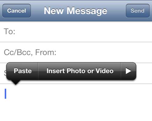 步驟 3:將手指按住電子郵件正文,然後鬆開手指即可看到下面的彈出窗口。點擊插入照片或視頻選項。