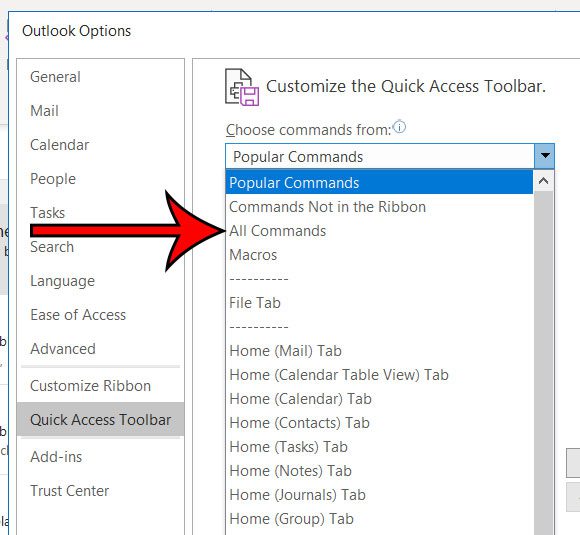 第 5 步:單擊從以下位置選擇命令下拉菜單,然後選擇所有命令選項。